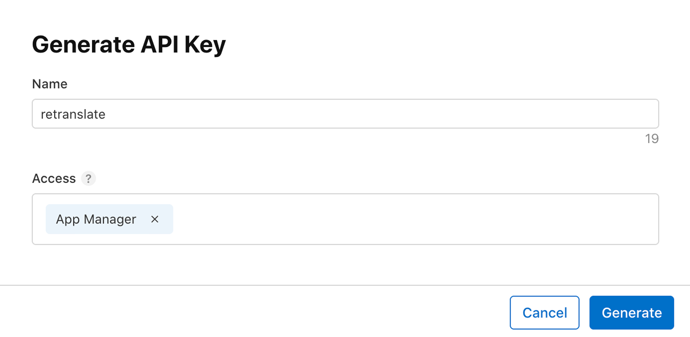 ⚠️ Important: Make sure to select "App Manager" access. Other access levels may not have sufficient permissions for metadata translation or may grant excessive privileges.