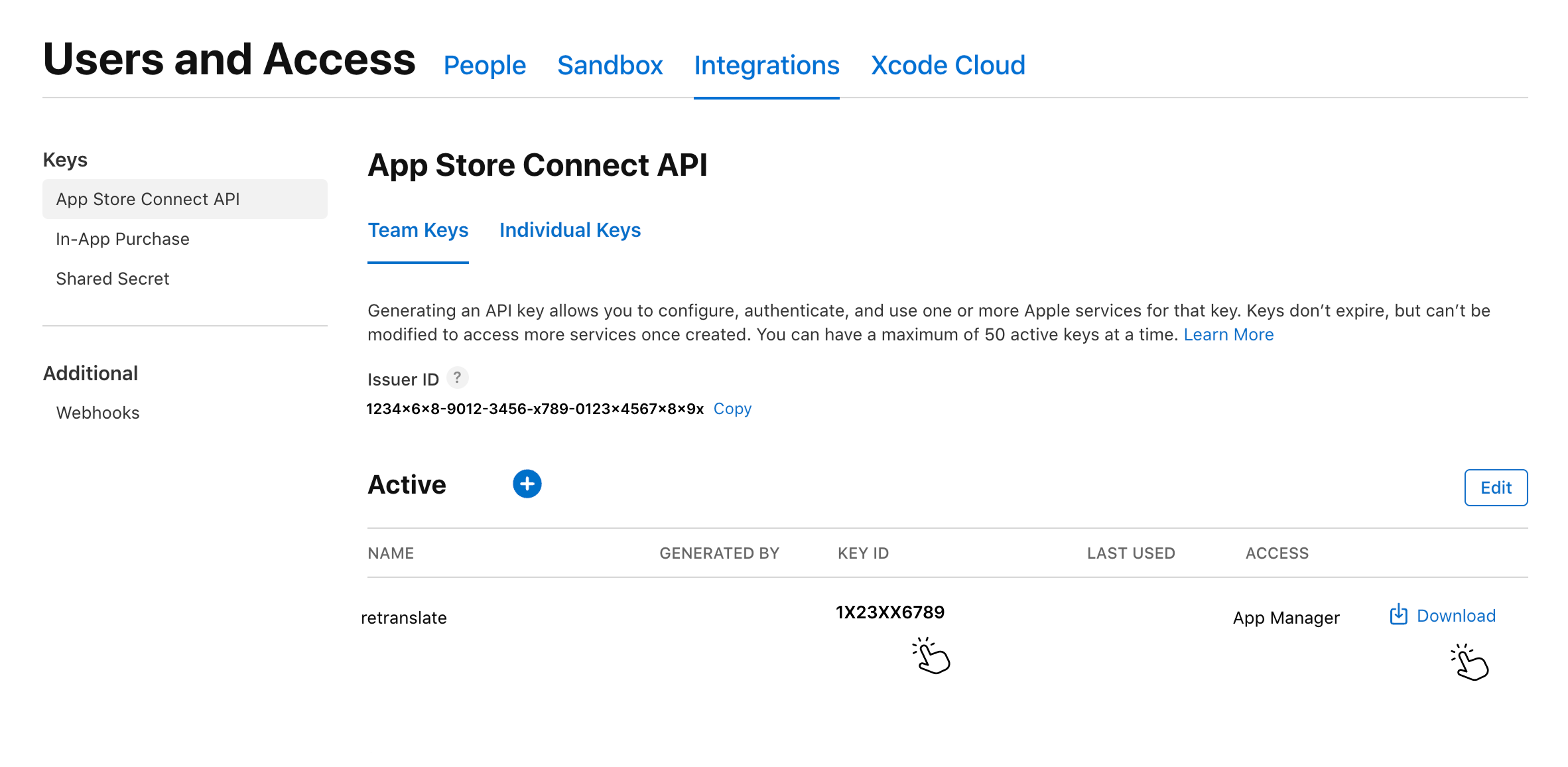 To integrate ReTranslate with your App Store Connect account, you need to generate an API key. This key allows secure, automated access to your app metadata for translation purposes. You'll need: